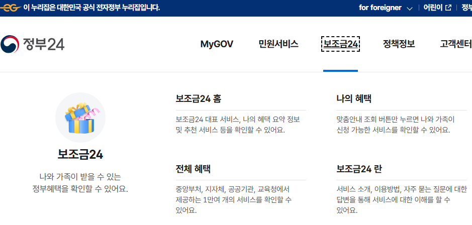 신청 방법은 매우 간단한데요, 정부24 사이트 내의 '보조금24' 서비스를 통해 온라인으로 신청할 수 있습니다.