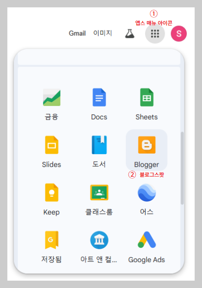 로그인 후 우측에 있는 구글의 앱스 메뉴 아이콘(①)을 클릭하면 구글의 아이콘들이 보입니다.(아래 이미지 참조)