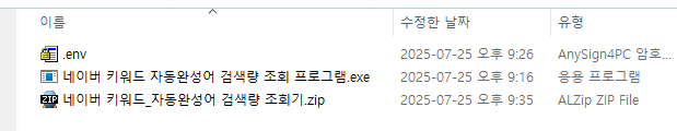압축을 풀면, 실행 파일(네이버 키워드 자동완성어 검색량 조회 프로그램.exe)과 .env 파일이 보입니다.