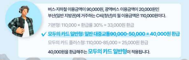 - 환급 방식 : 모두의 카드 일반형 2.8만원(9만-6.2만), 플러스형 2만원(12만-10만)