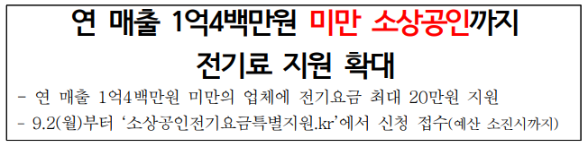 - 연 매출 1억4백만원 미만의 업체에 전기요금 최대 20만원 지원