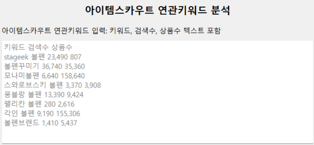 아이템스카우트 무료버전을 사용하다 보면 연관키워드 경쟁강도를 한눈에 보기 어렵다는 점이 가장 아쉽습니다.