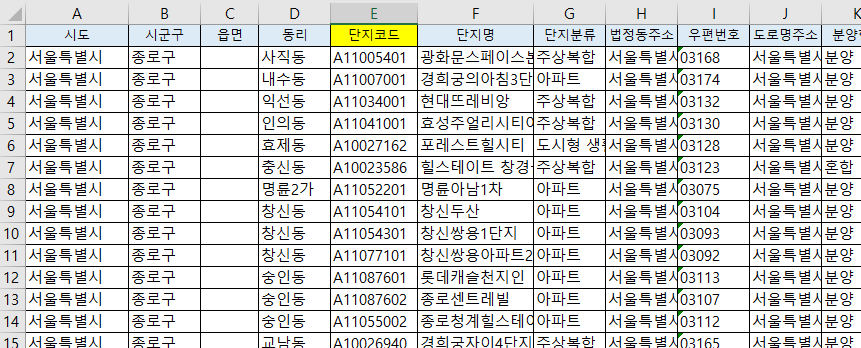 ※파이썬으로 아파트 표준 데이터(공동주택 기본 정보) 관련 정보를 얻기 위해 공공데이터 포털에서 제공하는 단지 코드를 API를 활용해보았다. 그런데 전국에 있는 아파트 전체에 대한 코드가