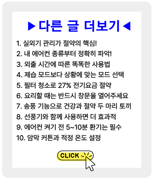 또한 장기 외출 시에는 에어컨 차단기를 내리는 것이 대기전력을 확실하게 차단하는 방법입니다. 이 두 가지는 전기요금 절감뿐 아니라 제품 위생 및 수명 연장에도 큰 도움이 됩니다.