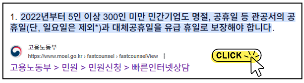 그런데 2022년부터 5인 이상 사업장에선 법정 공휴일이 유급휴일로 지정되었어요. 즉, 이제는 공휴일을 연차로 대체할 수 없습니다.