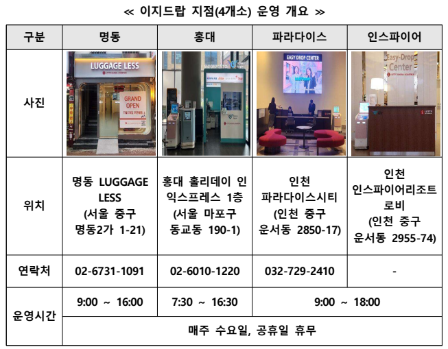 국토교통부와 인천국제공항공사에서 5월 29일부터 삼성역에서도 이지드랍 서비스를 시작한다고 발표했어요. 홍대, 명동, 인천에 이어 이제 강남 지역에서도 편리하게 이용할 수 있게 됐답니다.