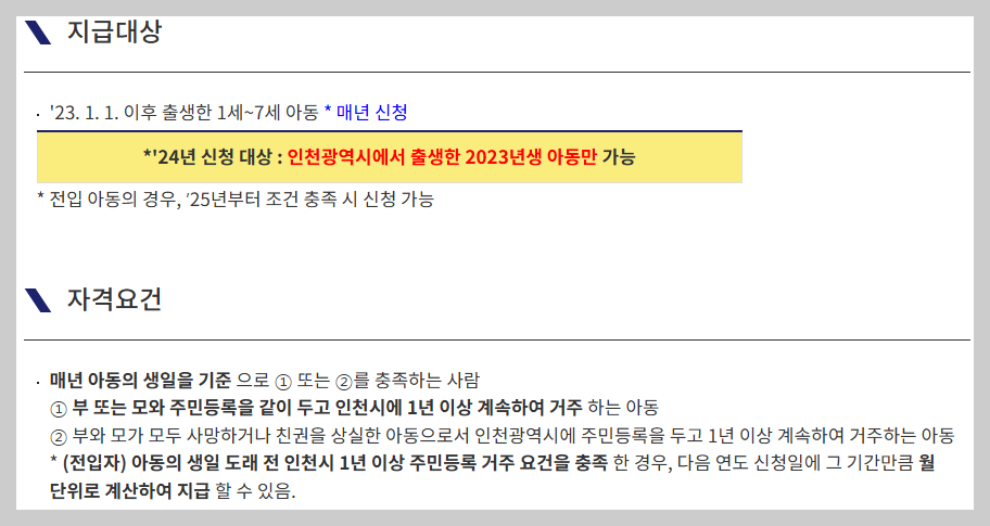 | 자격 요건 | 부모와 아이가 인천시에 주민등록상 1년 이상 거주 중이거나, 부모가 사망 또는 친권을 상실한 경우 아동이 인천시에 1년 이상 거주 중 |