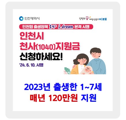 천사지원금은 인천시에 거주하는 부모님들에게 연간 120만 원을 지원해주는 제도입니다.