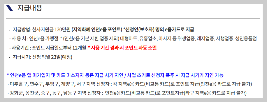 | 지급 방식 | 인천e음 포인트로 지급, 일부 업종 사용 제한 |