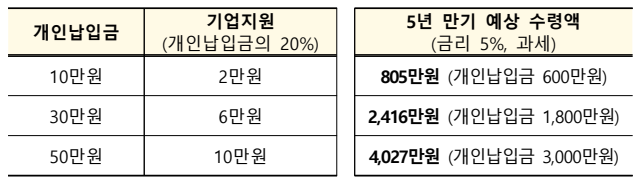 - 기업 지원금: 근로자 저축액의 20% 추가 지원