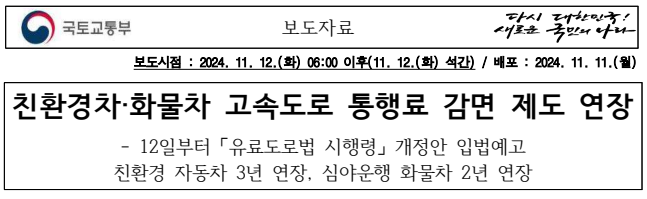이는 친환경차의 보급을 확대하면서도, 통행료 수입 감소로 인한 도로 유지 관리 부담을 함께 고려한 결정으로 보입니다.