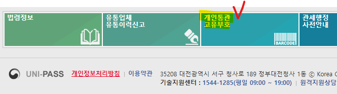 메인 화면 하단에 있는 '개인통관고유부호' 메뉴를 클릭합니다.