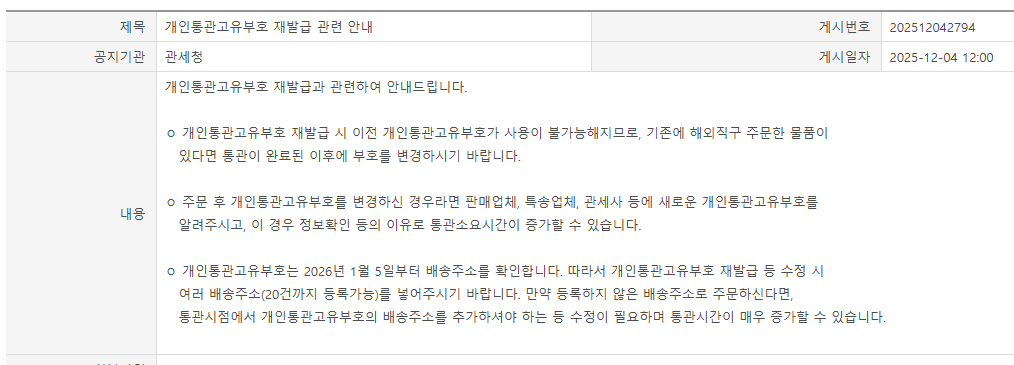 ※ 참고: 관세청 '개인통관고유부호 재발급 관련 안내 (2025-12-04)'