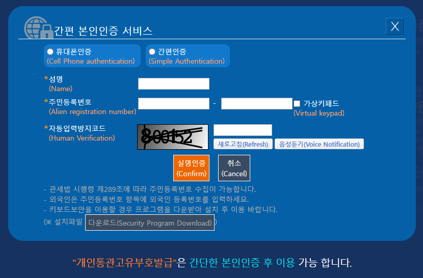 개인통관번호 신청 시 영문 이름, 우편번호를 정확히 기재