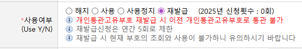 내용을 확인한 후, 수정할 사항은 다시 수정하고, 사용여부 항목에서 '재발급'을 선택한 후 저장 버튼을 누릅니다.