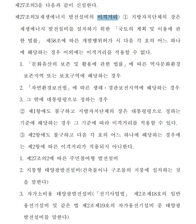 A: 아니요. 이번 개정안 제27조의3 제3항에 따라 지붕형 태양광은 이격거리 규제 적용 대상에서 제외됩니다.