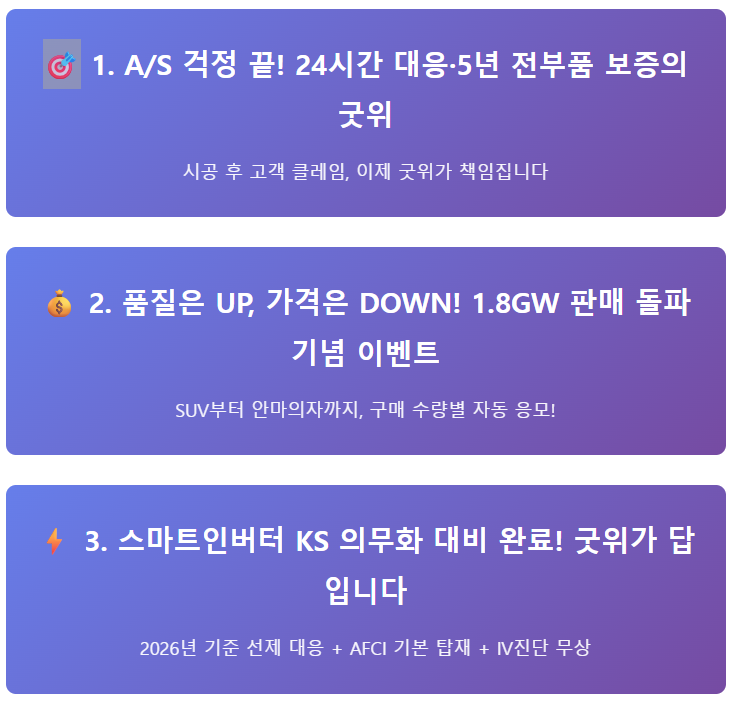 "다른 브랜드 쓸 때는 A/S 전화하면 일주일씩 기다리고, 부품 오는 데만 열흘... 발전소 주인분한테 죄인처럼 연락했었는데, 굿위는 정말 빨라요. 이제 고객한테 당당합니다!"