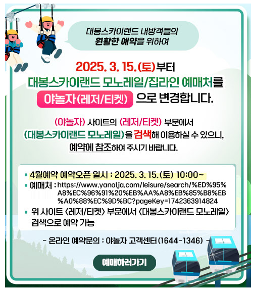 - 온라인 예약: 이용일 하루 전 밤 11시 59분까지 가능합니다. 네이버, 야놀자 등의 사이트에서 ‘함양 모노레일’을 검색한 후 예매하면 됩니다.