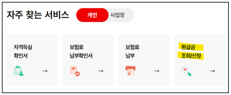 - 환급금 조회/신청 메뉴 선택: 중간에 있는 자주 찾는 서비스 4번째 항목에 '환급금 조회/신청'을 클릭하여 확인하고, 신청합니다.