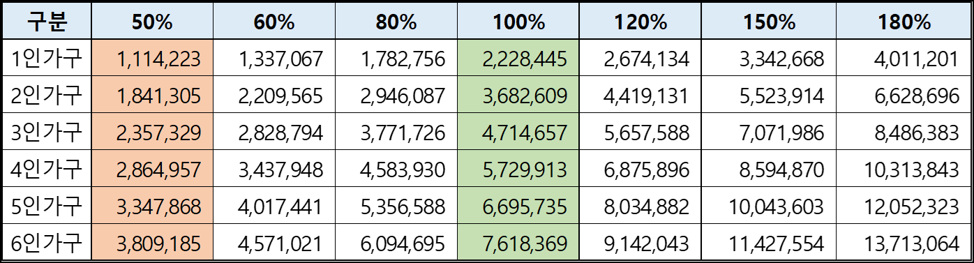 ▶ 2024년 기준 중위소득 50%, 60%, 80%, 100%, 120%, 150%, 180%