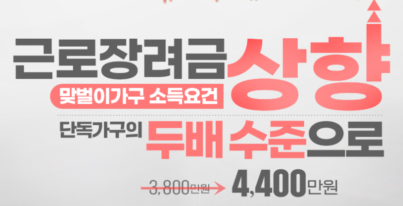 지난 4월 5일에 근로장려금 '맞벌이 가구' 소득 요건이 기존에 3,800만 원 미만에서 4,400만 원 미만으로 상향 조정되었습니다. (단독 가구의 두 배 수준으로 조정)
