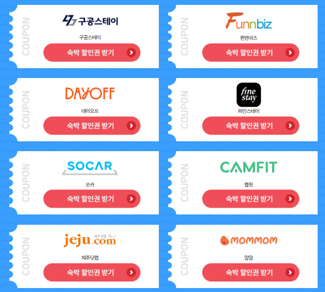 쿠폰은 야놀자, 여기어때, 인터파크, 하나투어, 트리플, 카카오톡 예약하기, 마이리얼트립, 스테이폴리오, 11번가, 옥션, G마켓, 쿠팡트래블, 넥스투어 등 다양한 온라인 여행사에서 받을 수 있어요.
