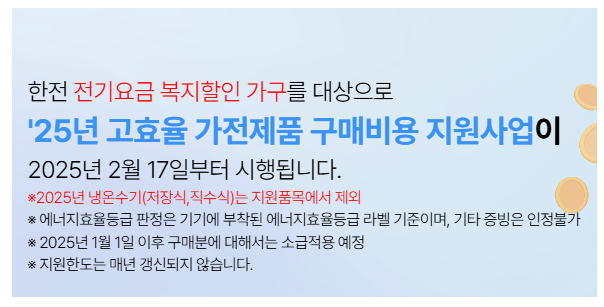 2025년부터 한국전력공사에서 전기요금 복지할인 가구를 대상으로 고효율 가전제품 구매비용 지원이 어떤 내용인지, 어떻게 신청하는지, 그리고 어떤 제품들이 지원 대상인지 속 알려드릴게요!